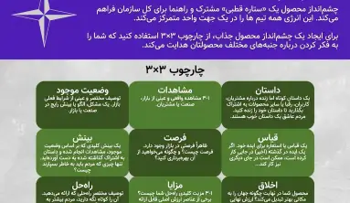 برای ایجاد یک چشمانداز محصول جذاب، از چهارچوب ۳x3 استفاده کنید که شما را راهنمایی میکند تا به جنبههای گوناگون محصول خود فکر کنید.